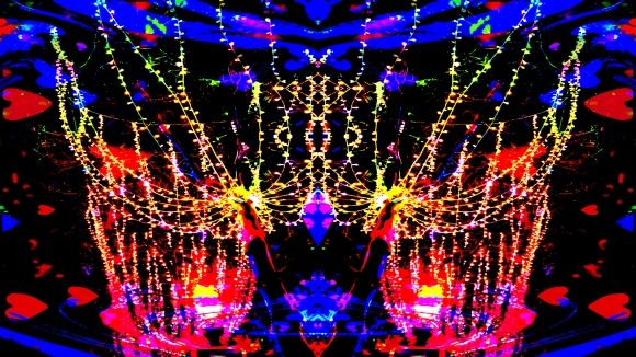 Cette photo modifiée a été superposée à l’image de cœurs multicolores, puis le résultat rendu plus éclatant avec un nouveau travail sur la luminosité et le contraste.