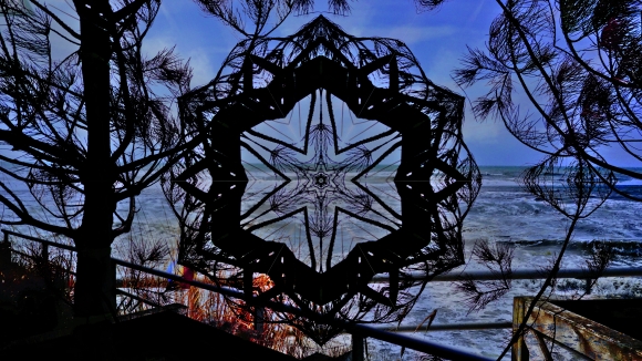 Pour réaliser cette photo, les photos d’origine 1 et 2 (prises à Merlimont, 62) ont d’abord été superposées, puis la nouvelle photo a été superposée avec la photo d’origine 3 et la partie comportant le ballon bleu/jaune/rouge a été copiée/collée dans la photo superposée 1 + 2. La photo ainsi réalisée a été transformée avec l’outil «kaléidoscope/multiplier» de GIMP qui y a introduit la figure hexagonale centrale. Cette photo intermédiaire a fait l’objet d’un travail sur les couleurs.