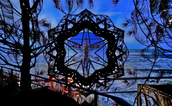 Pour réaliser cette photo, les photos d’origine 1 et 2 (prises à Merlimont, 62) ont d’abord été superposées, puis la nouvelle photo a été superposée avec la photo d’origine 3 et la partie comportant le ballon bleu/jaune/rouge a été copiée/collée dans la photo superposée 1 + 2. La photo ainsi réalisée a été transformée avec l’outil «kaléidoscope/multiplier» de GIMP qui y a introduit la figure hexagonale centrale. Cette photo intermédiaire a fait l’objet d’un travail sur les couleurs.